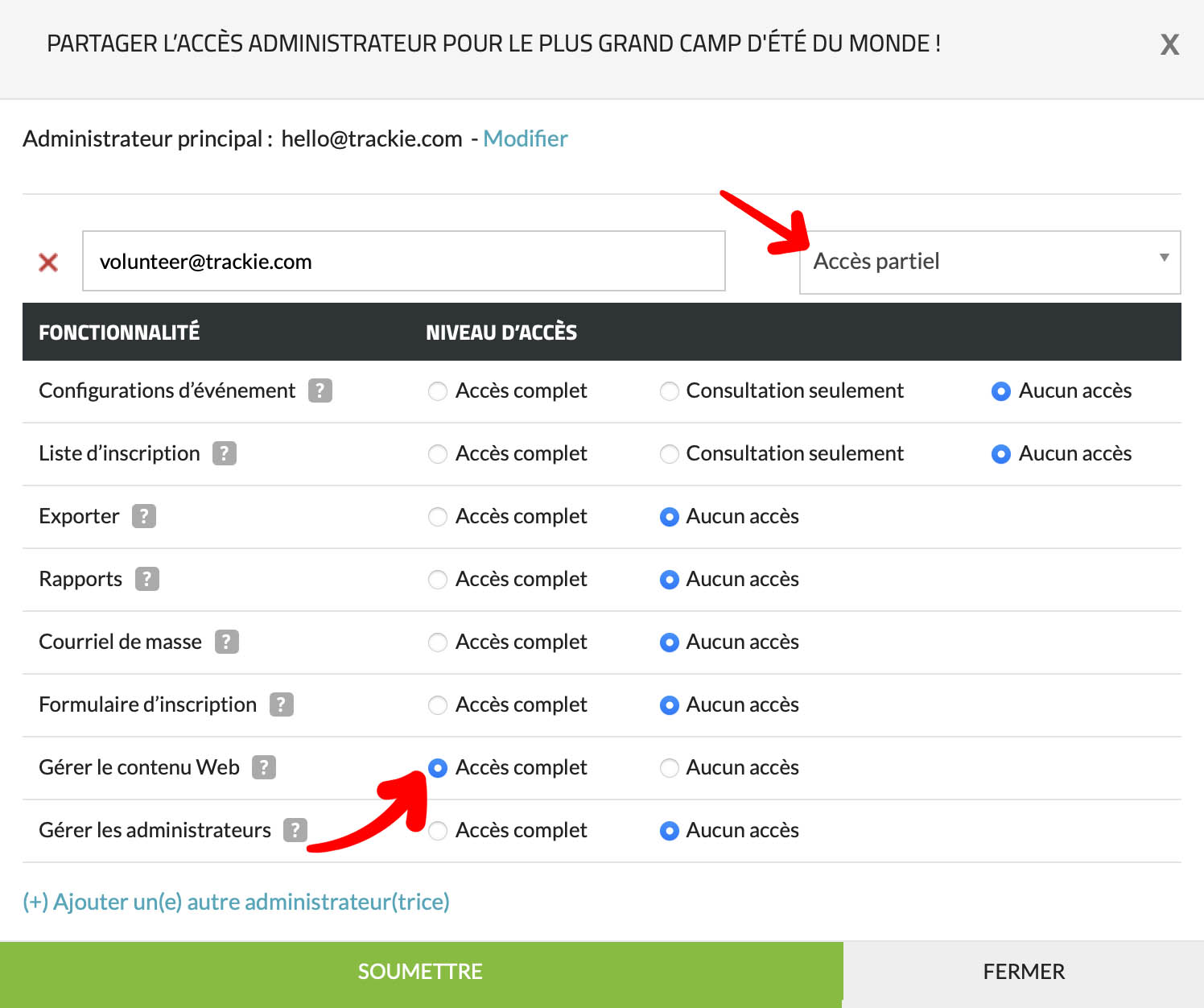 Dans cet exemple, nous donnons accès à volunteer@trackie.com, uniquement pour modifier le contenu de la page Web.
