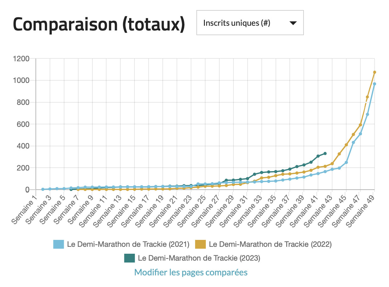 Nous avons ajouté une nouvelle fonctionnalité intéressante qui vous permet de comparer le rendement de vos inscriptions relativement à des années précédentes ou à d’autres événements de votre compte. De cette façon, vous pouvez suivre les augmentations ou les diminutions sur la base des semaines précédant votre événement.