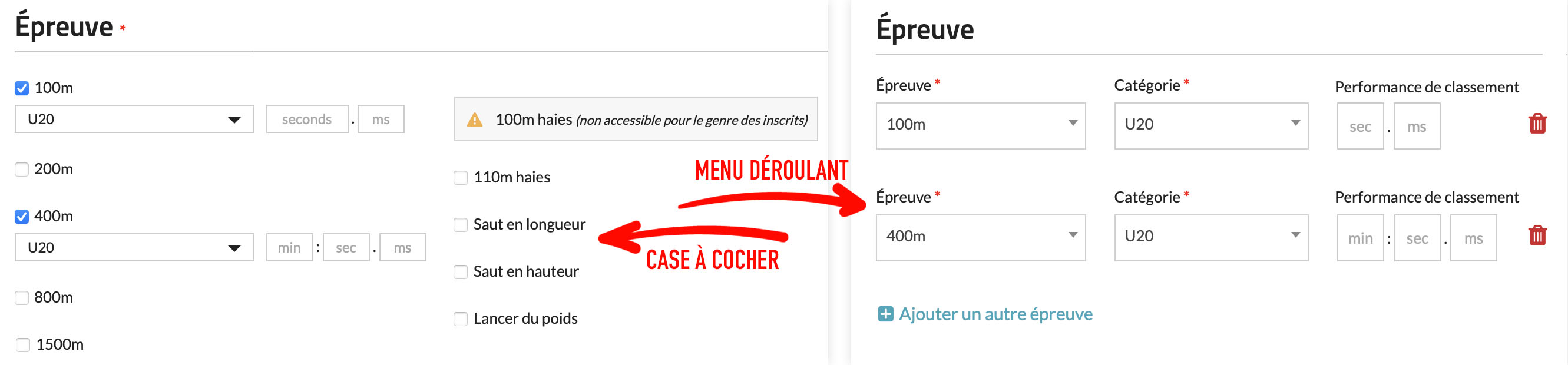 Vous pouvez maintenant choisir entre l’utilisation de cases à cocher ou de menus déroulants pour les épreuves/divisions individuelles.