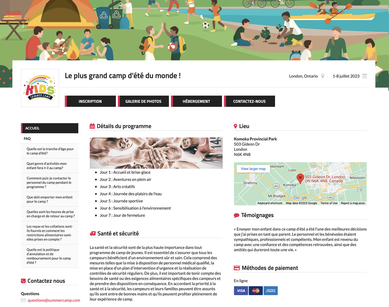 Exemple d’une page Web créée pour Le plus grand camp d’été du monde.