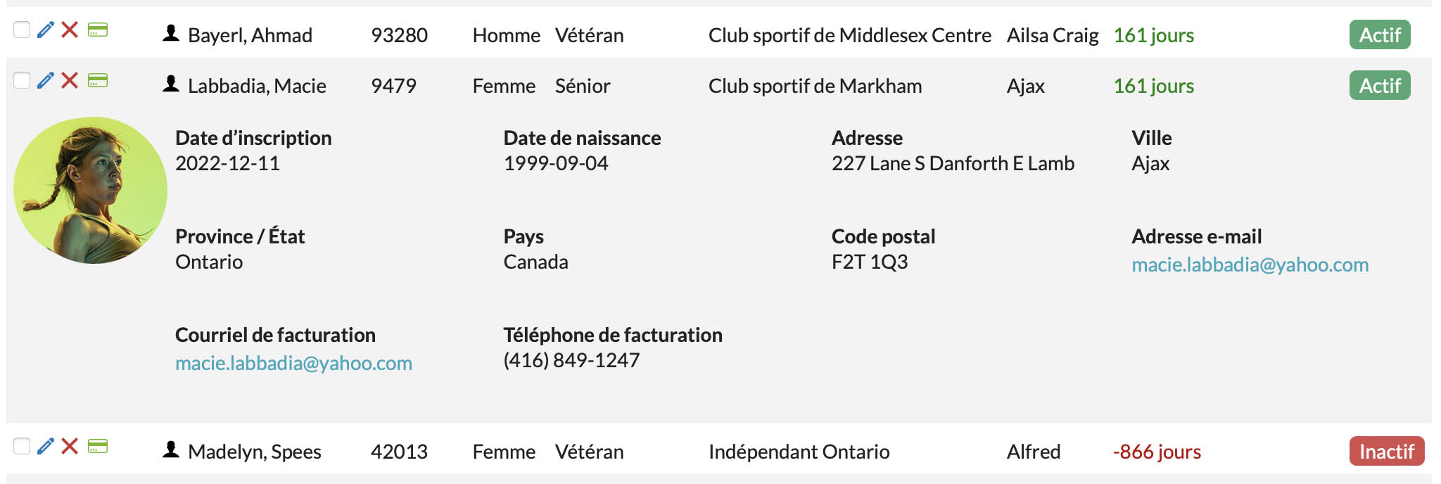 Dans cet exemple, nous avons cliqué sur Macie Labbadia pour voir plus d’information sur son inscription.