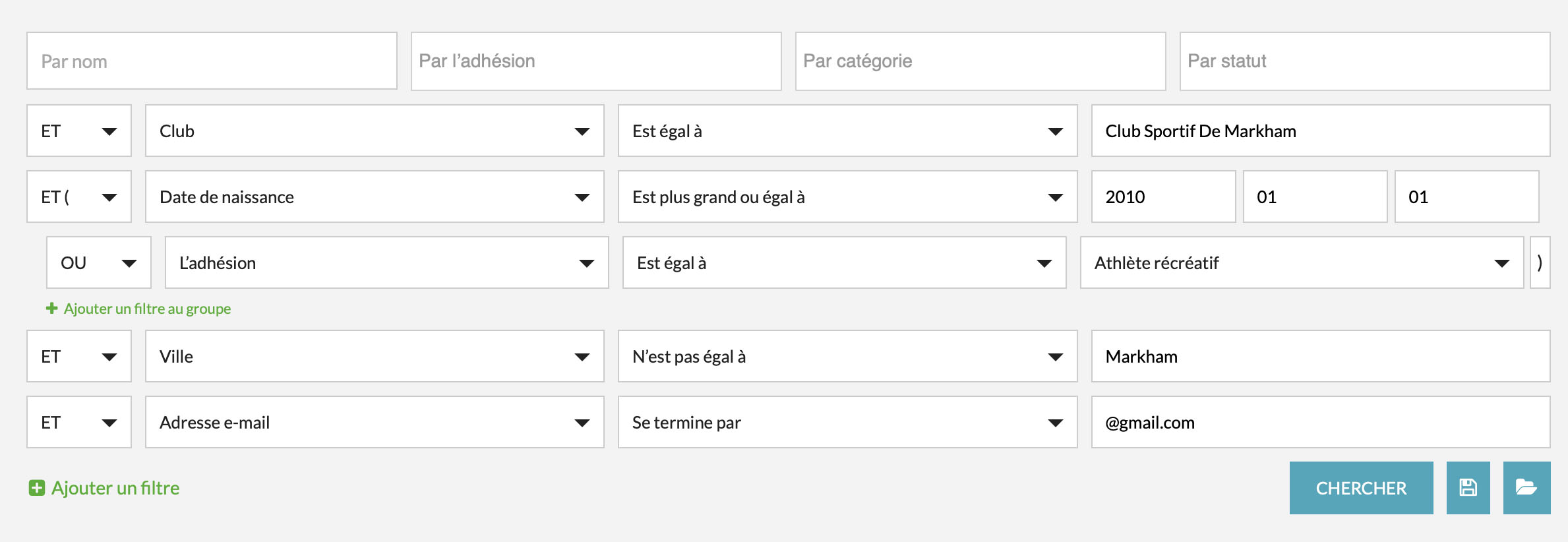 Ce filtre produirait les inscrits du Club sportif de Markham ET qui sont nés le 1er janvier 2010 ou après OU dont l’affiliation est Récréatif ET qui ne vivent pas à Markham ET qui ont une adresse courriel @gmail.com.