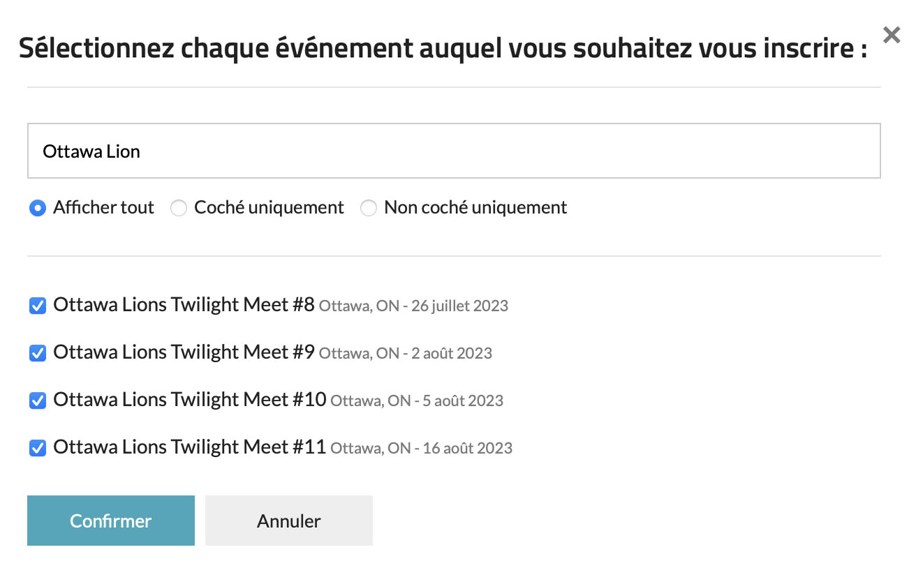 Les personnes peuvent maintenant s’inscrire à plus d’une épreuve à la fois. Par exemple, si vous comptez participer à toutes les rencontres Twilight Meets d’Ottawa au calendrier, vous n’avez plus à remplir un formulaire distinct pour chaque événement.