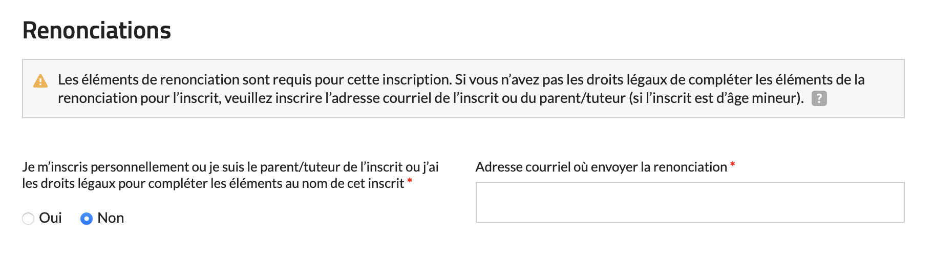 Si la personne qui effectue l’inscription ne détient pas les droits de remplir le formulaire de renonciation pour le/la participant(e).