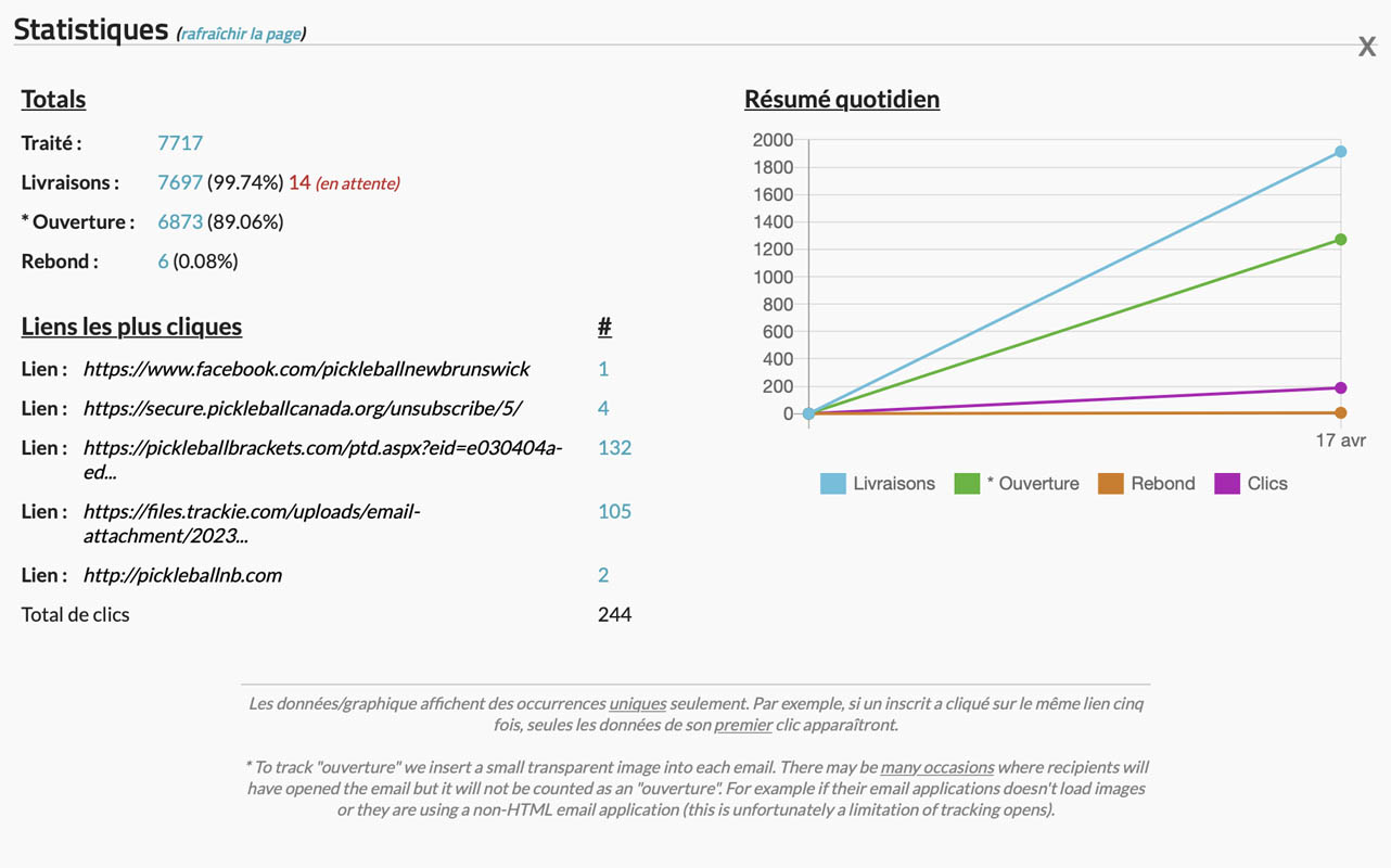Vous pouvez maintenant visionner les statistiques sur les livraisons, les courriels ouverts, les courriels qui rebondissent et les clics.