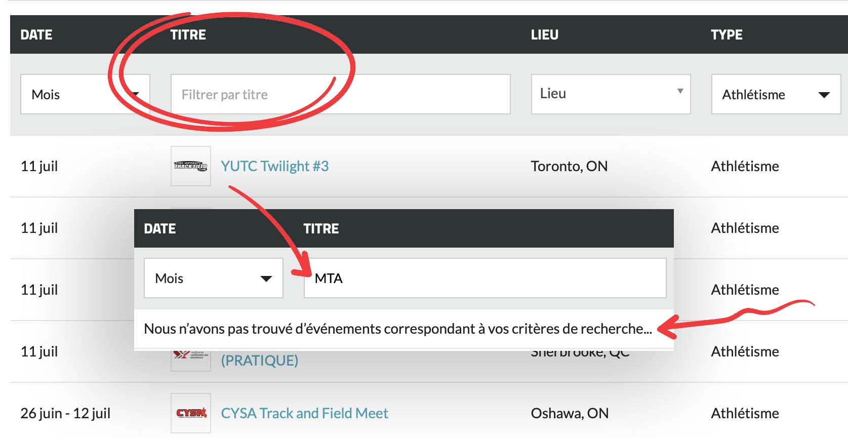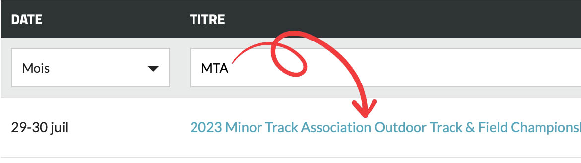 Quand les inscrits consultent le calendrier de Trackie.com, ils voient un grand nombre d’événements différents. Pour faciliter leur recherche, ils utilisent souvent les options de filtrage disponibles. C’est à cet endroit que la fonction « Mots-clés » s’avère très utile. Par défaut, les options de filtrage recherchent des correspondances partielles ou exactes basées sur le titre et le lieu de l’événement. Toutefois, l’ajout de mots-clés pertinents peut élargir le champ des termes de recherche qui mènent à votre événement. Par exemple, si votre événement s’intitule « Championnats d’athlétisme extérieurs de l’Association MTA », pensez à ajouter des mots-clés tels que « MTA », « Championnats de la MTA » ou tout autre terme que les inscrits potentiels pourraient rechercher pour essayer de trouver votre événement. En outre, l’intégration de fautes de frappe courantes ou d’expressions alternatives peut aider à trouver l’événement.