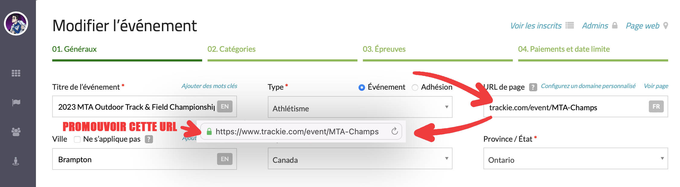 Pourquoi ne pas rendre l’accès à votre formulaire d’inscription aussi facile que possible pour les inscrits. Plutôt que d’indiquer simplement « Inscrivez-vous sur Trackie.com », fournissez-leur un URL menant directement vers votre page d’inscription. Nous offrons la possibilité de créer un URL court et personnalisé que vous pouvez facilement promouvoir. Ce faisant, vous permettez aux inscrits d’accéder directement à votre formulaire d’inscription, éliminant ainsi le besoin de recherches supplémentaires.
