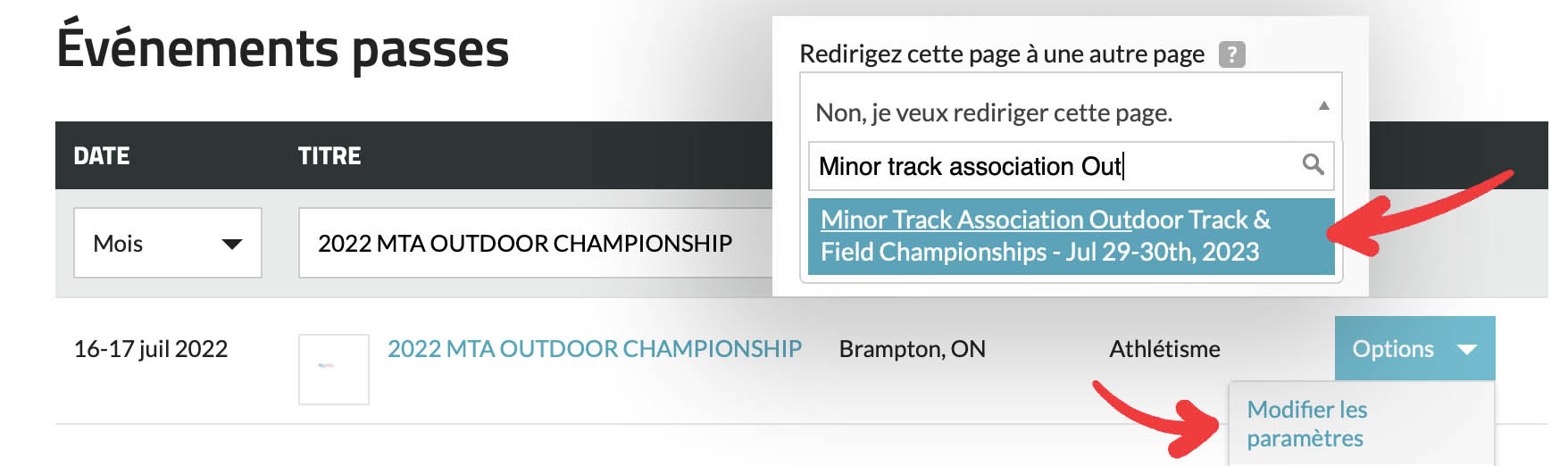 Sous « Rediriger cette page vers une autre page », sélectionnez la page de votre événement de l’ANNÉE EN COURS.