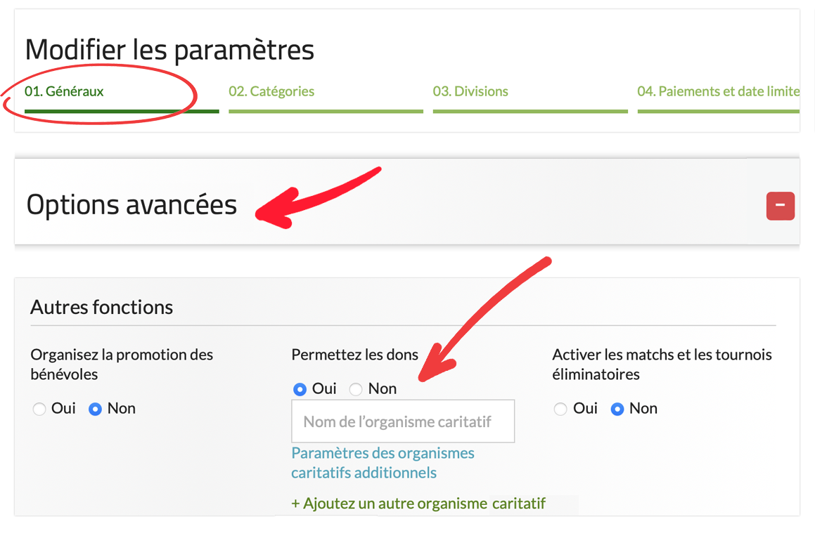 - Réglez l’option « Activer les dons » sur « Oui » et cliquez sur « Paramètres » pour poursuivre la configuration.
