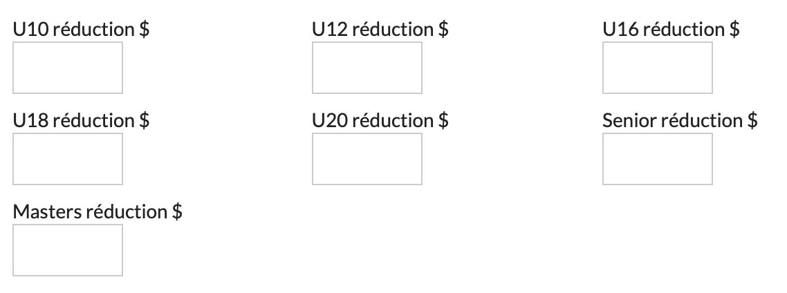 Ce paramètre vous permet de spécifier les types de frais d’inscription qui feront l’objet d’un rabais. Par exemple, si vous avez configuré des achats supplémentaires au moment de l’inscription, comme l’achat d’un t-shirt, et que vous souhaitez que la réduction ne s’applique qu’aux frais d’inscription et non à l’achat du t-shirt. |