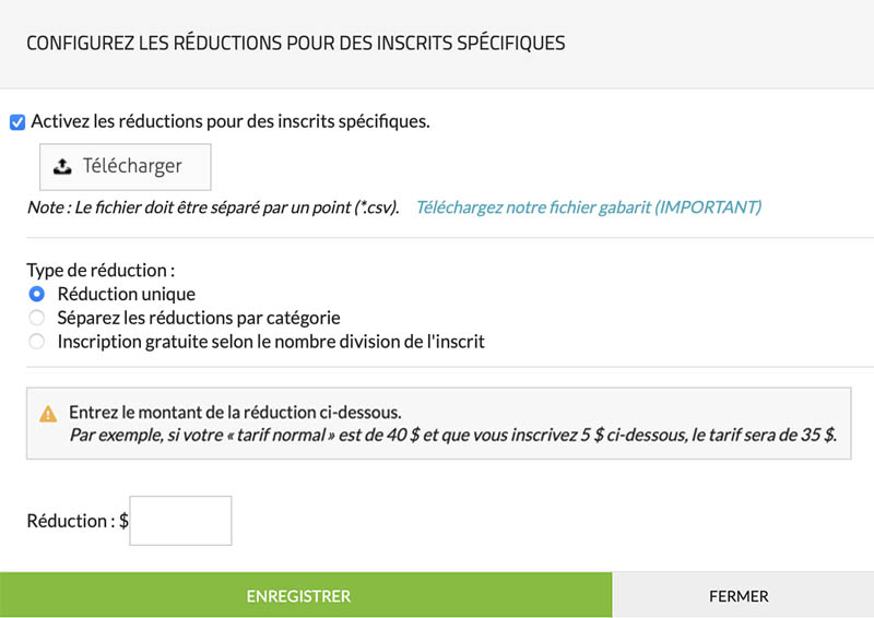 Cette fonction vous permet de télécharger une liste de noms d’inscrits auxquels vous souhaitez accorder un tarif réduit.Voici à quoi ressemble l’interface pour « + Configurer les rabais pour des inscrits particuliers ».