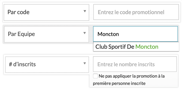 En fonction du type de promotion que vous avez sélectionné, ce champ de saisie vous permettra de saisir le code promotionnel, l’adhésion de l’équipe ou le # d’inscrits, comme le montre l’image ci-dessous.
