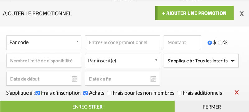 Cette fonction vous permet de créer des codes promotionnels, de proposer des tarifs réduits en fonction de l’adhésion des inscrits à une équipe ou d’offrir des rabais en fonction du nombre total d’inscrits.Voici à quoi ressemble l’interface « + Gérer les promotions ».