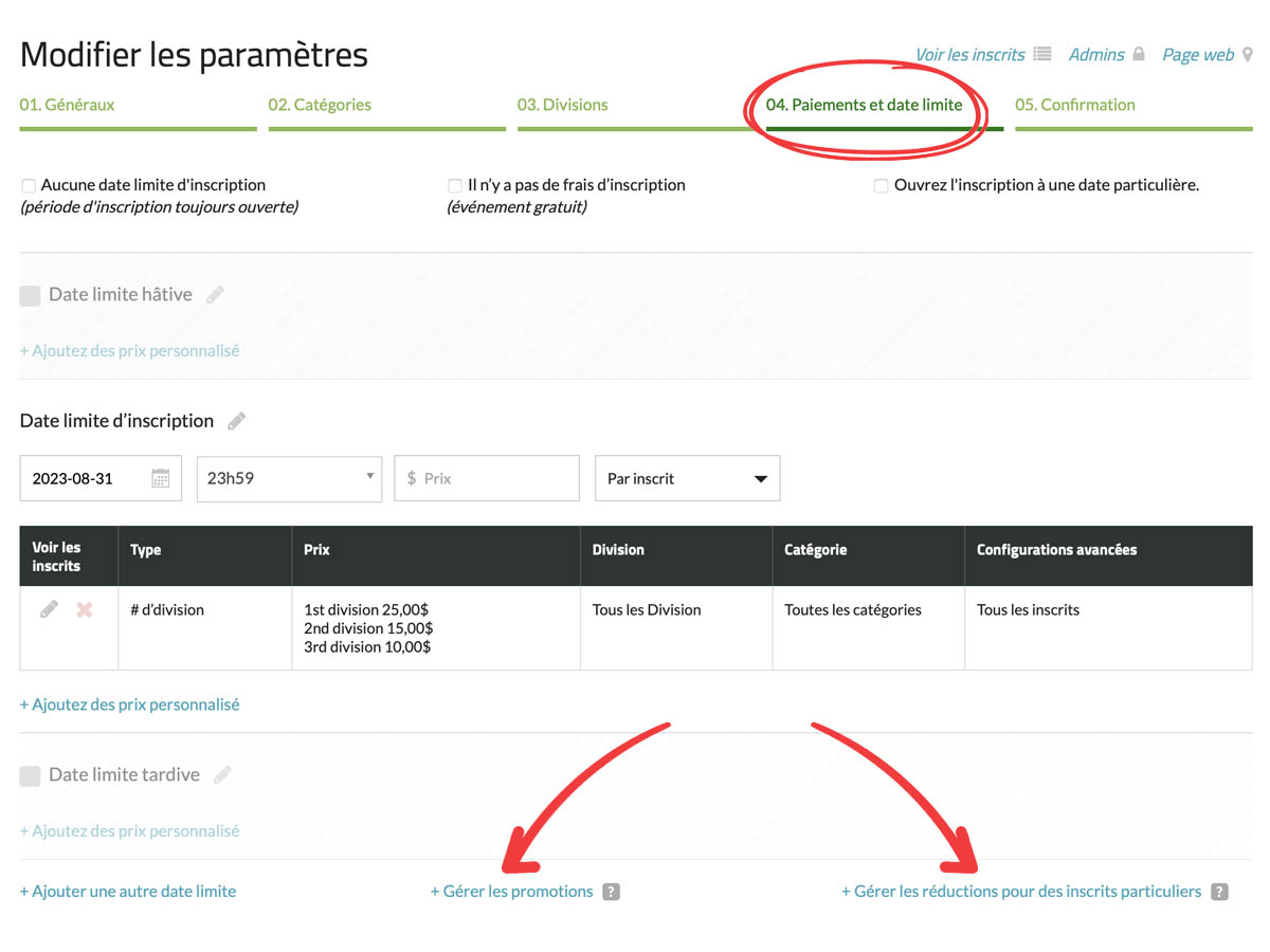 Plusieurs options sont disponibles pour mettre en place des promotions permettant d’offrir des rabais à des personnes spécifiques au cours du processus d’inscription. Pour accéder à ce paramètre, vous devez d’abord créer un formulaire d’inscription. Une fois créé, dans vos paramètres, naviguez jusqu’à la section « Étape 4 : Paiements et date limite ». Vous y trouverez deux sections permettant de mettre en place des réductions et des promotions : « + Gérer les promotions » et « + Gérer les rabais pour des inscrits particuliers ».