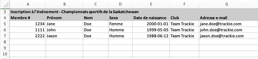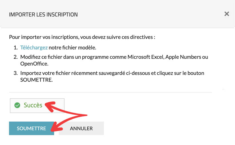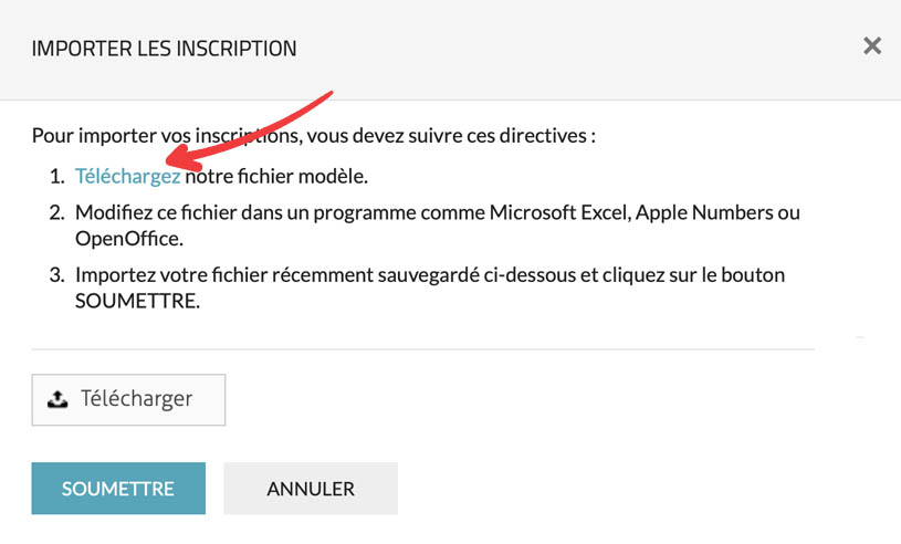 Vous avez la possibilité d’importer des données dans le formulaire d’inscription à partir d’un fichier .xlsx, qui peut être édité dans votre tableur préféré, tel que Microsoft Excel. Pour en savoir plus sur l’importation, cliquez ici.