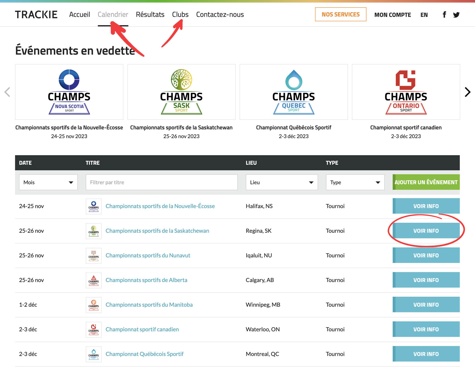 Cliquez sur le bouton « VOIR INFO » à côté de l’événement ou du club auquel vous souhaitez vous inscrire.