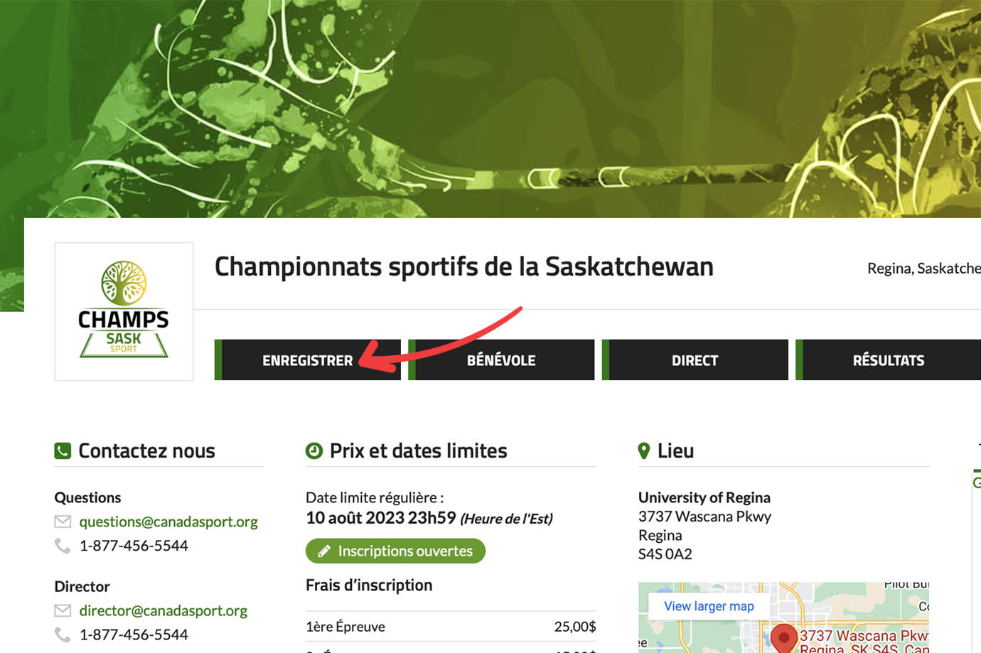 En cliquant sur le bouton « VOIR INFO », vous serez dirigé vers une page Web où vous pourrez accéder à des informations détaillées sur l’événement ou le club. Dans ce cas, pour procéder à l’inscription, cliquez sur le bouton « Inscription ». Si l’événement ou le club n’utilise pas notre page Web, vous serez automatiquement redirigé vers leur formulaire d’inscription.