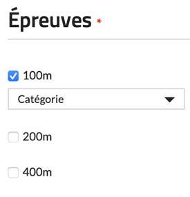 Si l’événement ou le club propose plusieurs divisions ou événements individuels à choisir au moment de l’inscription, vous pourrez les sélectionner ici. Les options peuvent être présentées sous forme de menus déroulants ou de cases à cocher, en fonction des paramètres de l’événement ou du club.