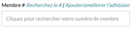 Si un numéro de membre est requis pour l’inscription, vous pouvez avoir accès à un outil de recherche de vos informations de membre. En outre, si vous n’êtes pas encore membre, vous pouvez avoir la possibilité d’ajouter ou d’améliorer votre adhésion (veuillez noter que cette fonction n’est disponible que pour les organisations qui utilisent notre système pour la gestion des adhésions).