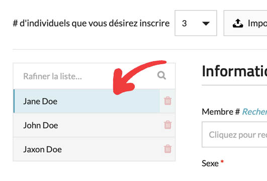 Quand vous avez plus d’un inscrit, la liste des inscrits apparaît sur le côté gauche.