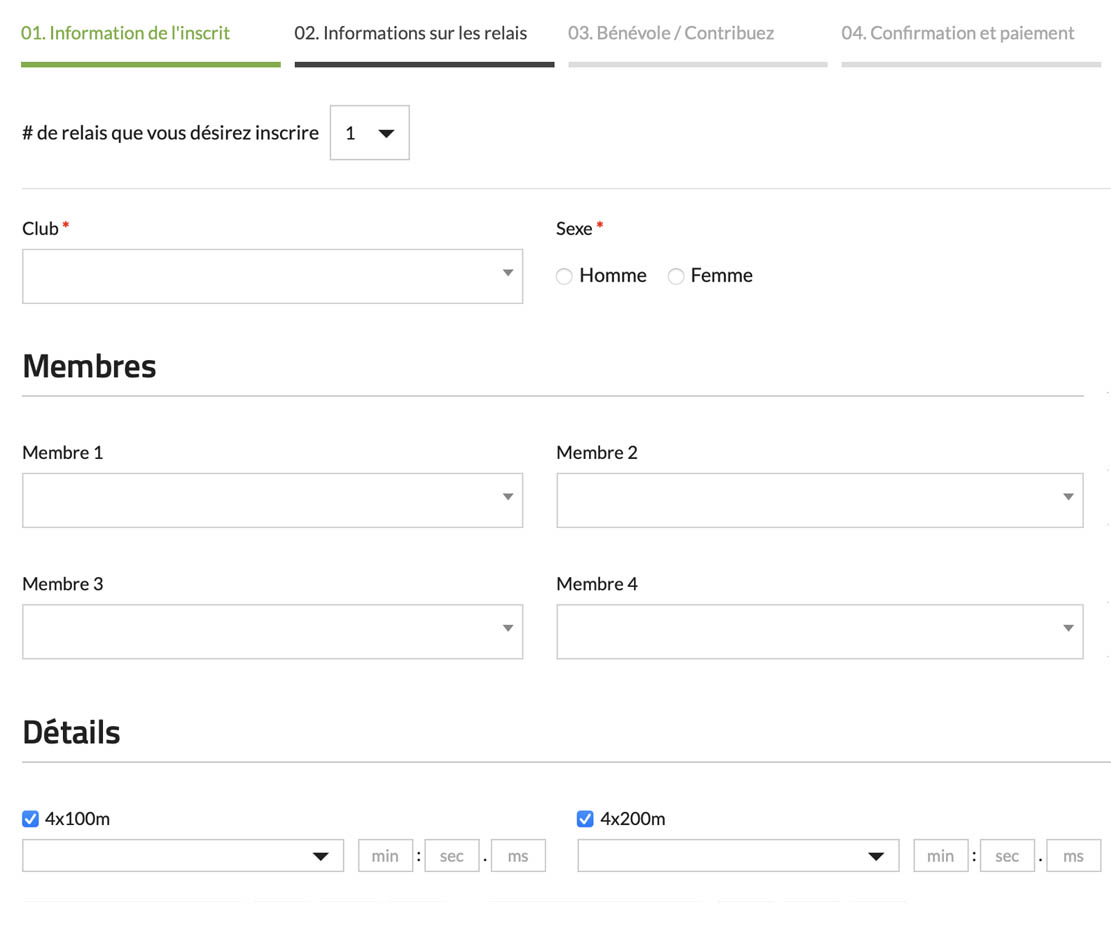 - Informations sur les relais : Si l’événement comprend des épreuves de type équipe (par exemple, « Relais » en athlétisme ou « Kata par équipes » en karaté), cette étape vous permet de saisir toutes les informations nécessaires pour vos entrées de type équipe, telles que les noms des membres de l’équipe. (+) Voir l’exemple