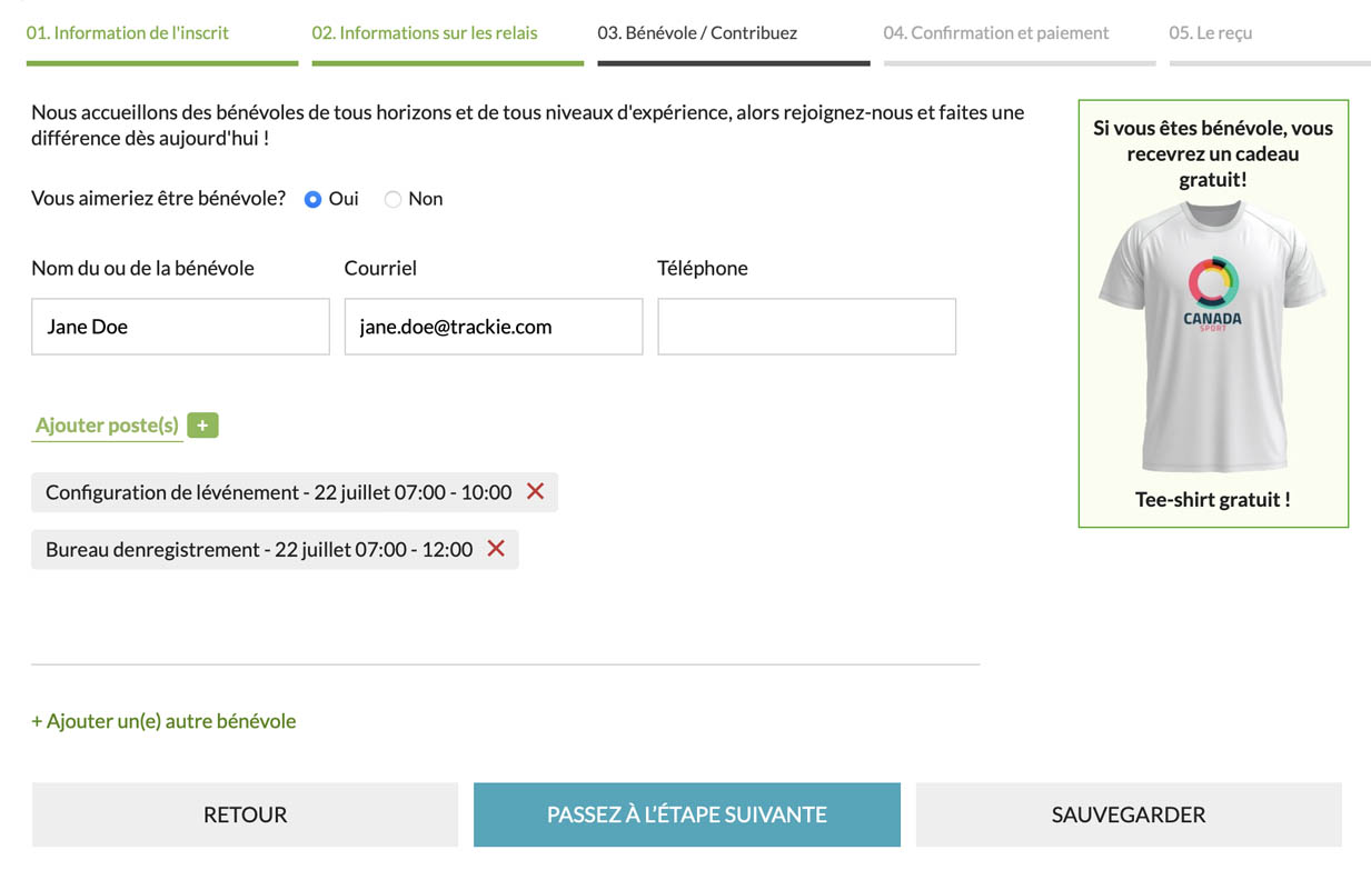 - Bénévole/contribution : Si l’événement ou le club recherche des bénévoles, cette étape est facultative pendant le processus d’inscription. (+) Voir l’exemple