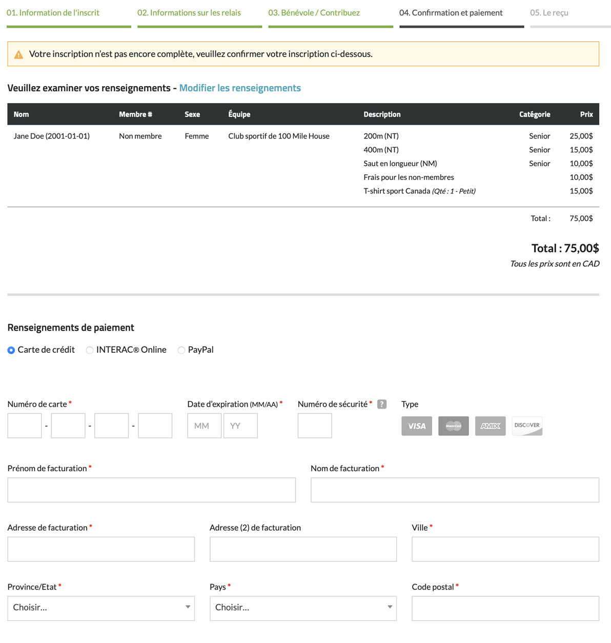 - Confirmation et paiement : Cette étape affiche les détails du paiement de l’inscription, y compris les frais éventuels, et offre la possibilité de saisir les informations relatives à la carte de crédit si un paiement en ligne est nécessaire. (+) Voir l’exemple