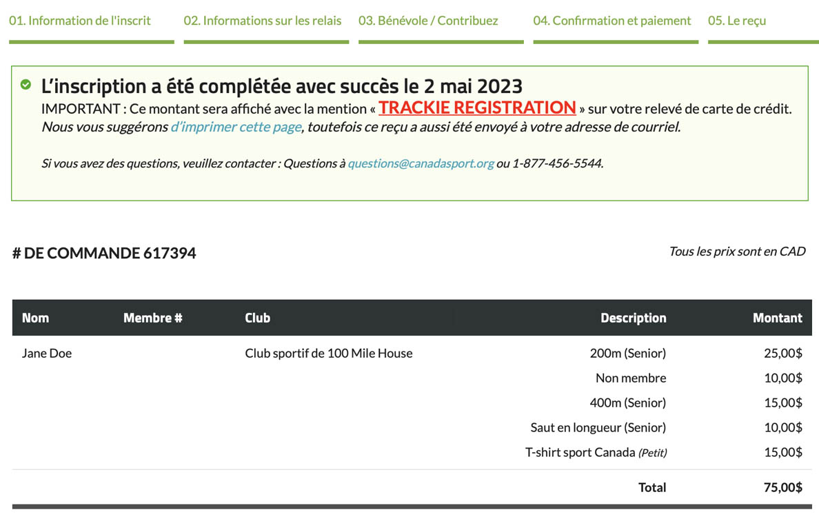 - Reçu : À l’issue de la procédure d’enregistrement, vous recevrez un reçu de transaction, qui vous sera également envoyé par courrier électronique pour vos archives. (+) Voir l’exemple