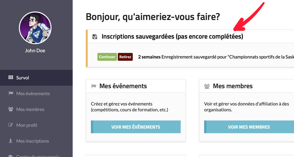 3. Quand vous êtes prêt(e) à reprendre le travail sur vos données d’inscription, il vous suffit de vous connecter à votre compte et vous trouverez vos inscriptions sauvegardées en haut de votre tableau de bord.