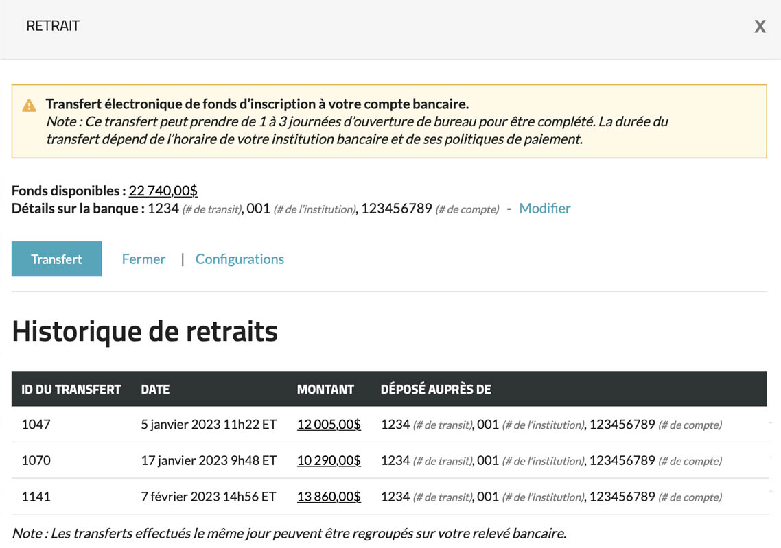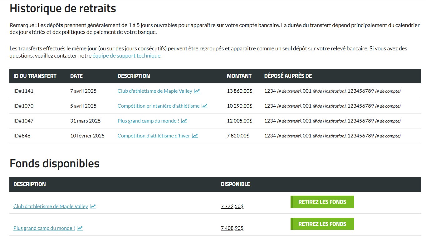 La section Historique de retraits vous offre une vue centralisée de tous les dépôts effectués sur votre compte à travers vos pages d'événements et d'adhésion - le tout en un seul endroit pratique.