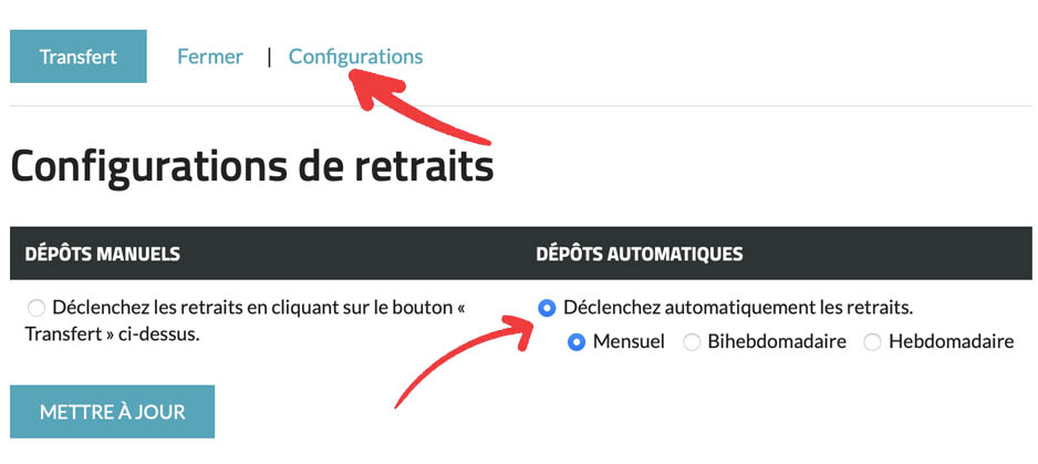 Offre la possibilité de configurer le système pour qu’il effectue des retraits automatiques sur votre compte bancaire.