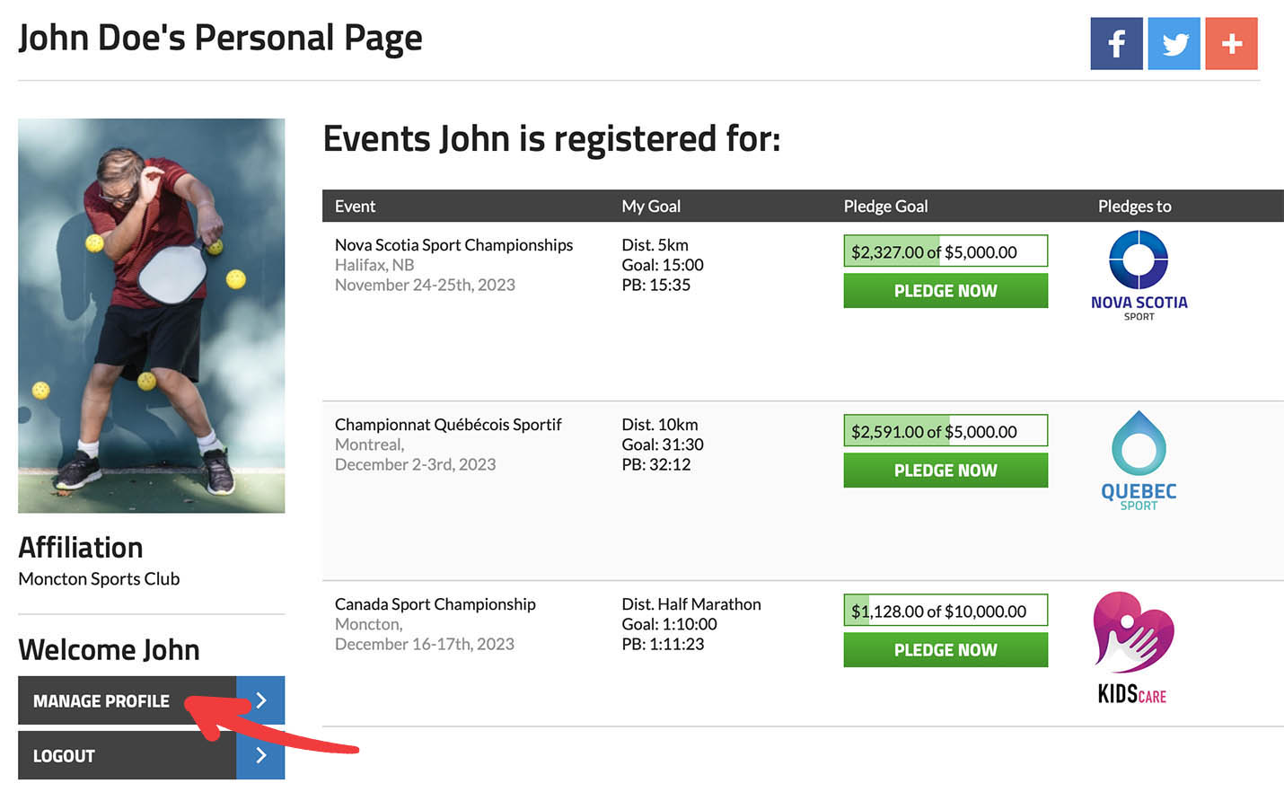 Your personalized pledge page will display a list of all the events you've registered for that are accepting donations, along with the total amount you've raised so far. To edit and manage your page, simply click on the "Manage Profile" button.