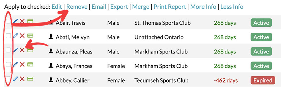 2. Check the checkbox to the left of the registrant's name, and then click the "Remove" link next to "Apply to checked" (allows for refunding multiple registrants at once).