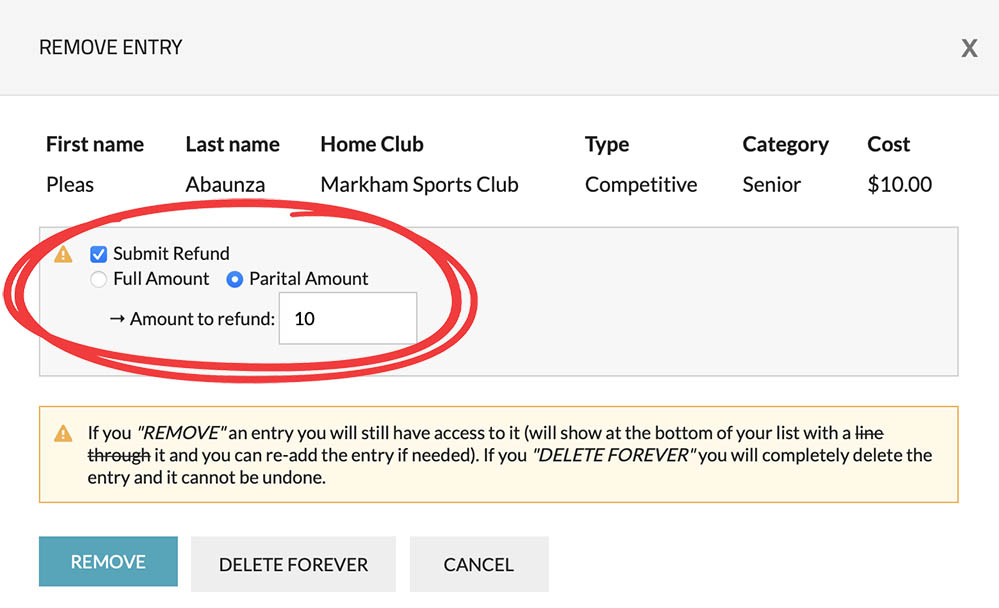 3. In the "Remove Entry" pop-up, you can select the option "Submit Refund" and indicate whether you wish to issue a "Full Amount" or "Partial Amount" refund. When selecting the "Partial Amount" refund option, you can enter the specific amount that you want to refund.