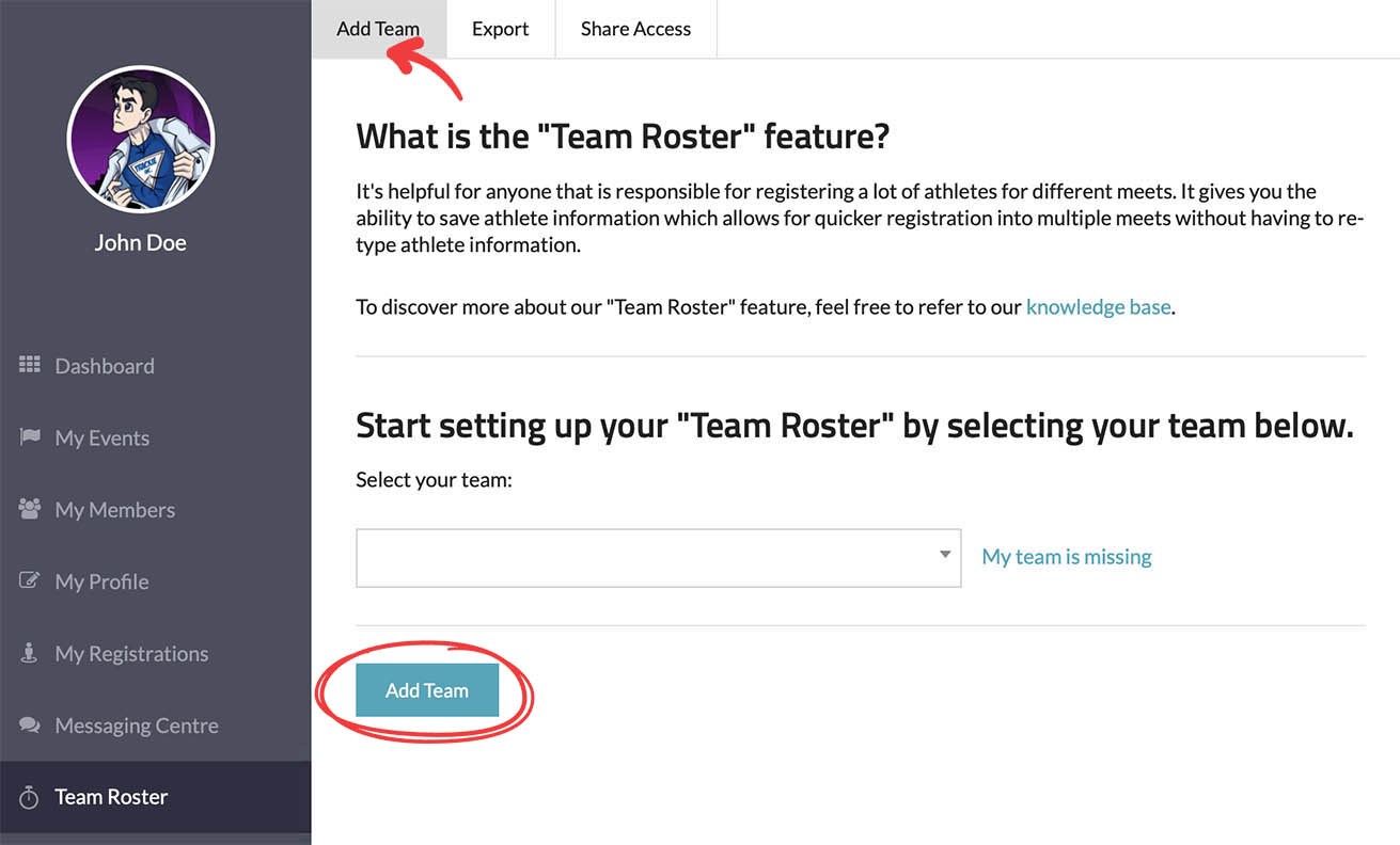 Before utilizing the "Team Roster" section, you will need to add at least one team. To begin, select your team and click on the "Add Team" button.