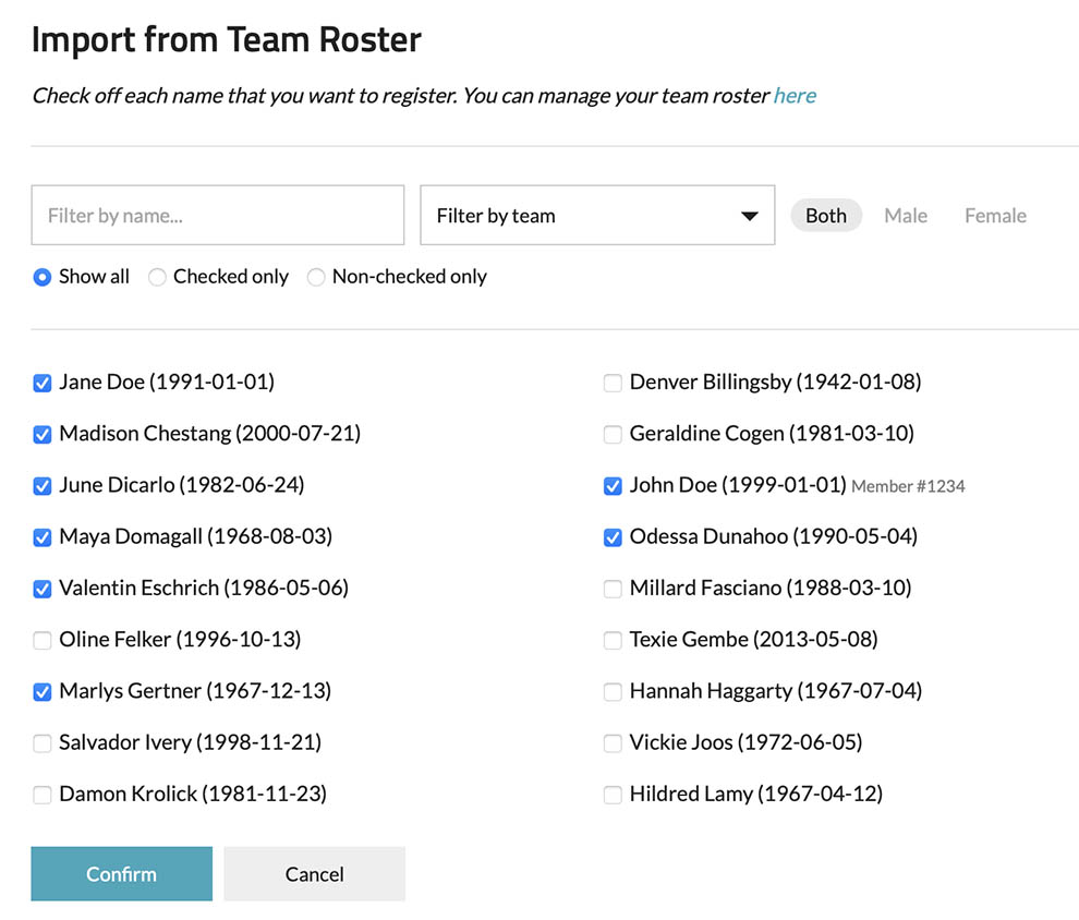 4. Select each athlete from your team roster that you want to register for the event and then click on the "Confirm" button.