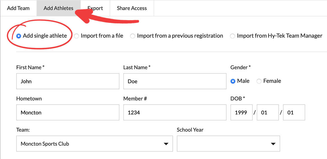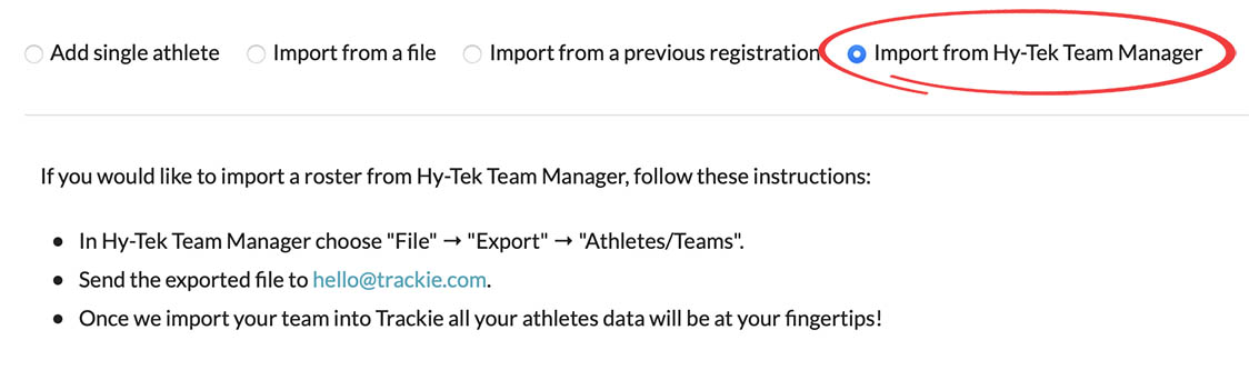 4. Import from Hy-Tek Team Manager: If you use Hy-Tek Team Manager, email us your "Athletes/Teams" file and we can help import your athletes for you.