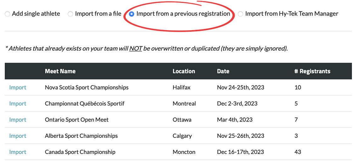 3. Import from a previous registration: If you already registered for other events on the system we can import your past registrations into your team roster.