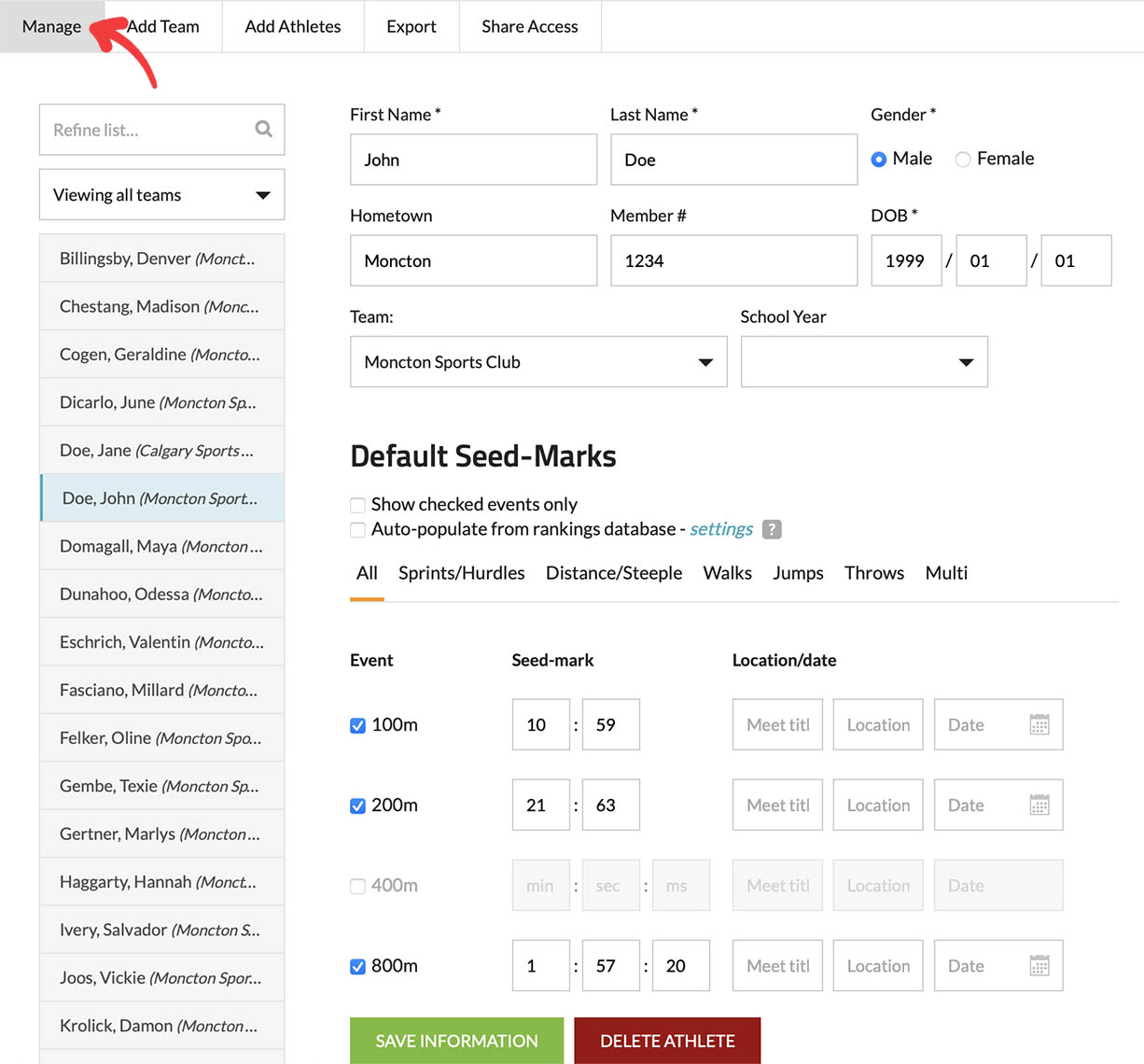 After you have added athletes to your roster, you can manage them in the "Manage" section. Here, you can easily modify athlete information, add default seed marks (for sports such as track and field), or remove athletes who are no longer a part of your team.