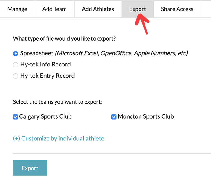 If you have multiple teams you can also select which team(s) you want to export or even drill down to what individual athletes you want exported.