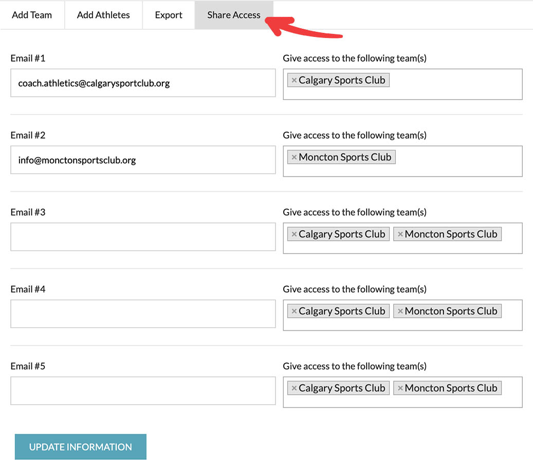 We offer the ability to share your team roster with other email addresses, allowing you to customize the access of each email to specific teams. This is particularly useful in situations where a school has multiple coaches who require access to the same team roster.